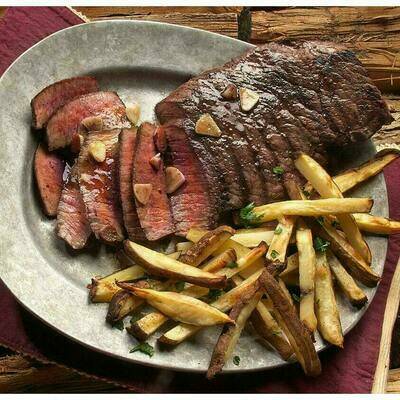 Das Flat Iron Steak ist ein noch relativ neuer und unbekannter Steak Cut aus der Rinderschulter. Die Form der herausgelösten flachen Cuts, erinnerte an ein Bügeleisen (Flat-iron).